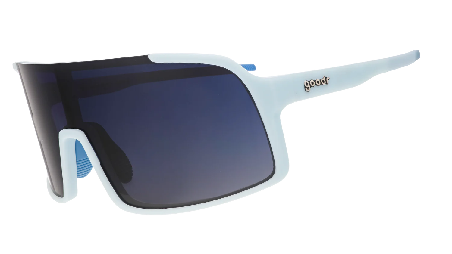 Monturas sin montura de color azul. Las lentes polarizadas degradadas reducen el resplandor del sol que brilla sobre el exoesqueleto metálico de tu secuestrador. No resbalarán ni rebotarán mientras intentas escapar desesperadamente de tus captores ciborg. (P.D. La resistencia es inútil).
